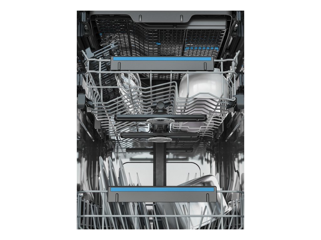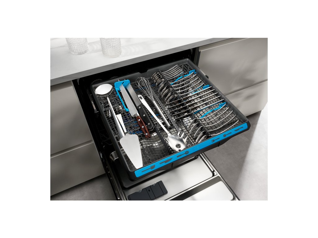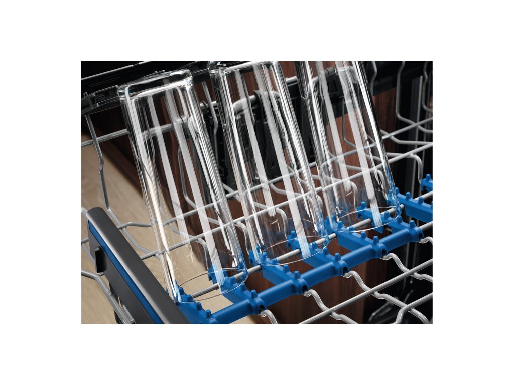 Vlastnosti horného koša: | 2 modré úchyty na poháre na víno, 2 modré mäkké pogumované hroty na pridržiavanie skla, sklopné držiaky na poháre, plastová farebná rukoväť |